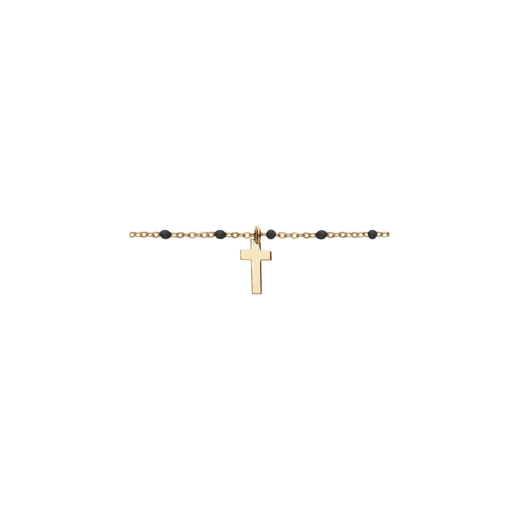 Bracelet argent et dorure jaune boules résine noires avec croix 15+3cm