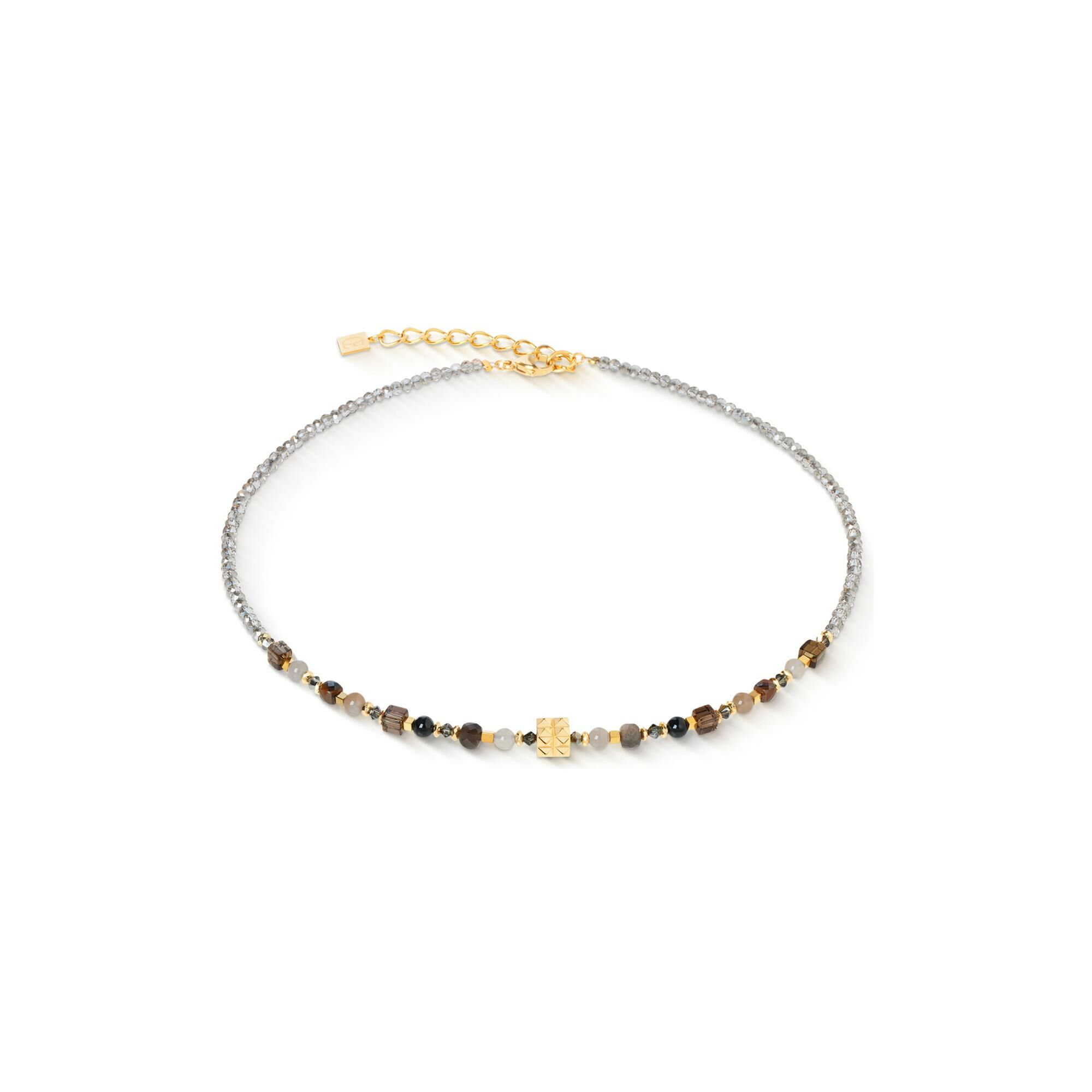 Collier Coeur de Lion Shape Mix Spikes en acier doré, quartz fumé, pierre de lune et onyx, agate, oeil de tigre, cristaux Swarovski et verre